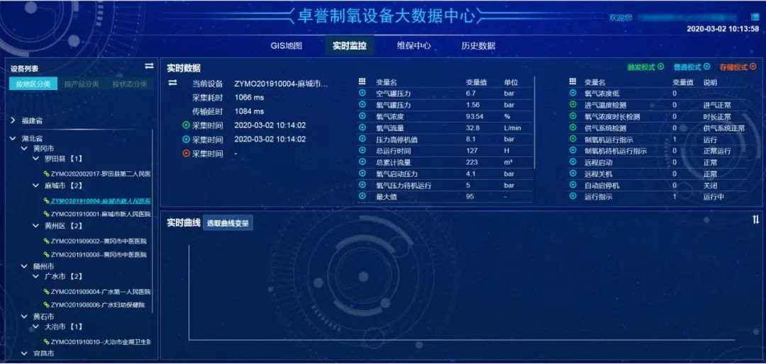 基于树根科技根云平台的底层支持,,,,,投入使用后,,,,,院方医护职员就可以在手机上实时审查和监控制氧装备的运行状态、氧气浓度、压力、流量等参数。。。。。