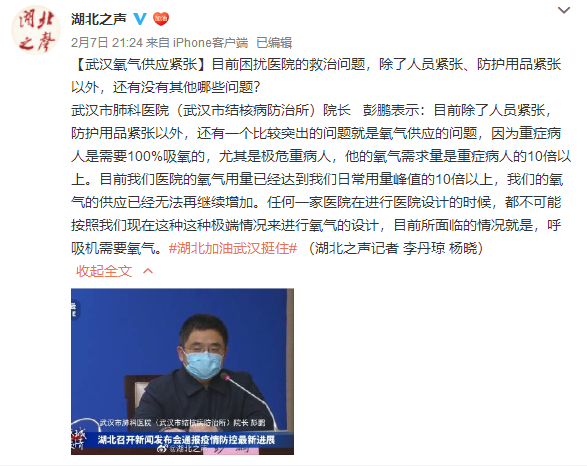 早在2月7日,,,,,武汉市肺科医院院长彭鹏就曾体现,,,,,除了职员、防护用品主要以外,,,,,尚有一个突出问题就是氧气供应。。。。。